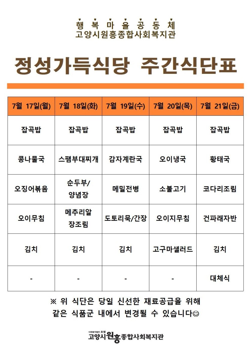 일반 7월 3째주 정성가득식당 식단 안내 페이지 정보 작성자 관리자 댓글 0건 조회1,841회 작성일 23-07-17 09:44 목록 본문 이전글7월 4째주 정성가득식당 식단 안내 23.07.25 다음글직원(사회복지사) 채용 공고 23.07.14 댓글 0개 댓글목록 등록된 댓글이 없습니다.
