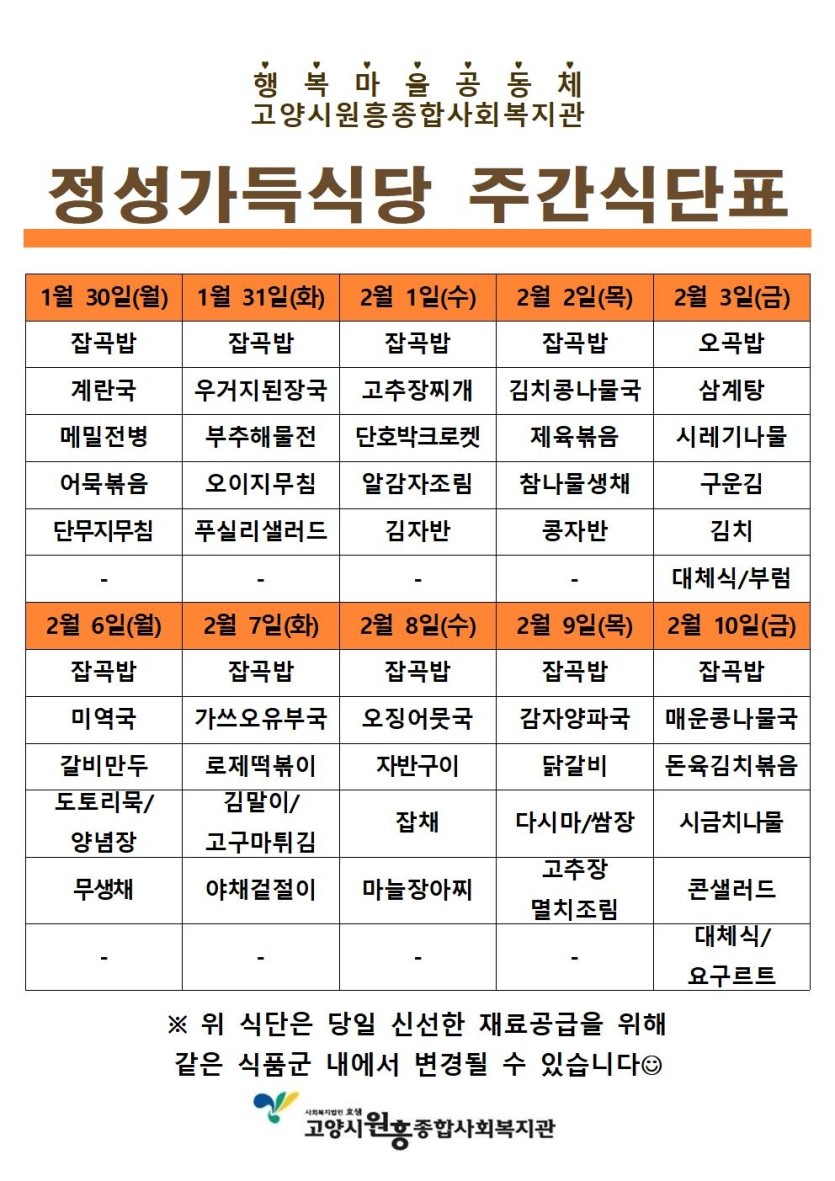 일반 2월 첫째주, 둘째주 정성가득식당 식단 안내 페이지 정보 작성자 관리자 댓글 0건 조회1,638회 작성일 23-02-06 11:27 목록 본문 이전글직원(팀장) 채용 최종합격자 명단 공지 23.02.10 다음글직원(팀장) 채용 연장 공고 23.01.26 댓글 0개 댓글목록 등록된 댓글이 없습니다.