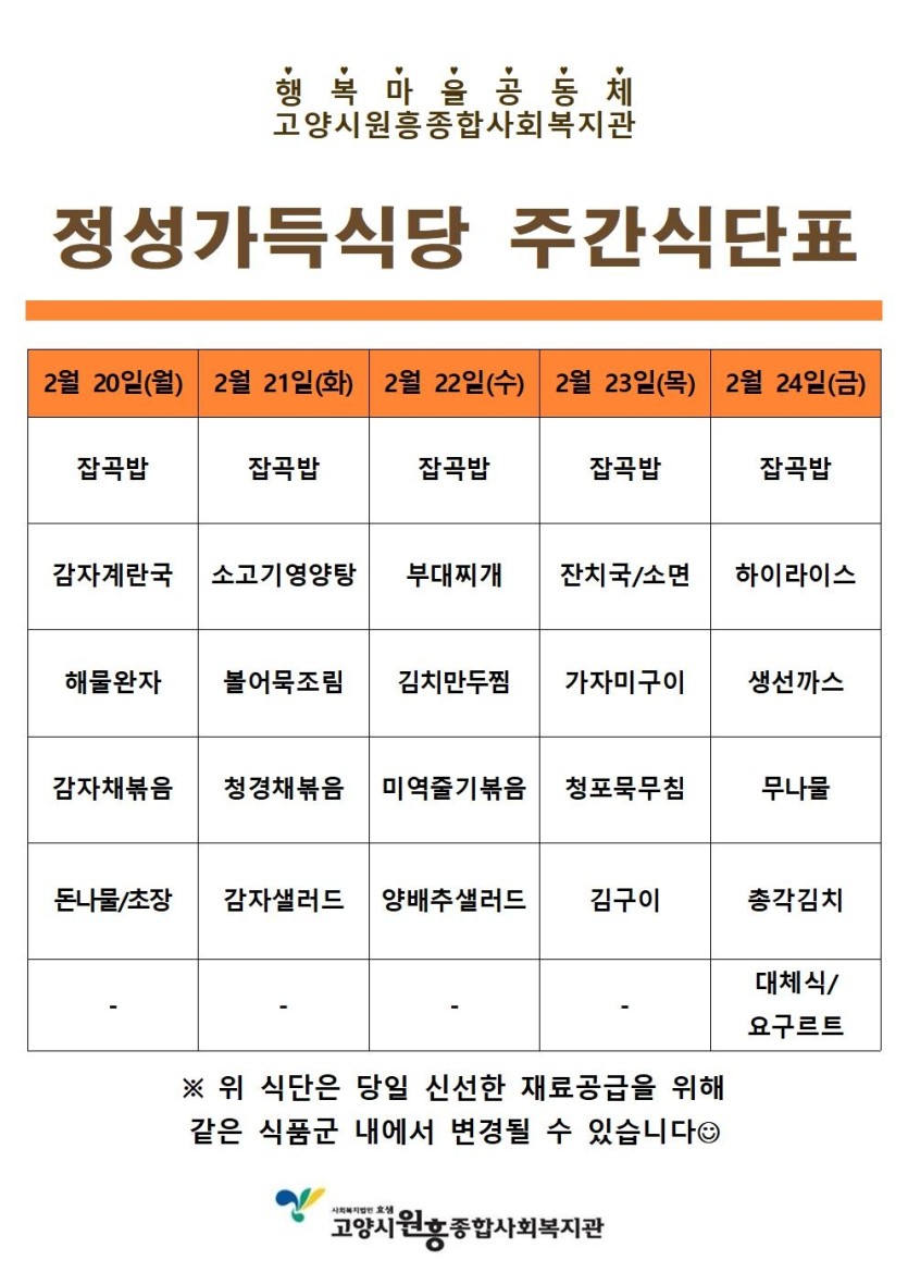 일반 2월 넷째주 정성가득식당 식단 안내 페이지 정보 작성자 관리자 댓글 0건 조회1,640회 작성일 23-02-20 11:58 목록 본문 이전글3월 1째주 정성가득식당 식단 안내 23.02.22 다음글직원(팀장) 채용 최종합격자 명단 공지 23.02.10 댓글 0개 댓글목록 등록된 댓글이 없습니다.