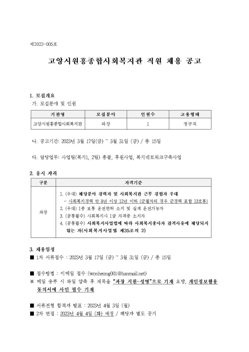 채용공고 [재공고] 직원(과장) 채용 공고 페이지 정보 작성자 관리자 댓글 0건 조회1,791회 작성일 23-03-17 15:20 목록 본문 [재공고] 직원(과장) 채용 공고 첨부파일 입사지원서 양식(2023).hwp (18.5K) 이전글2022년 제4차 운영위원회 회의록 공고 22.12.21 다음글3월 4째주 정성가득식당 식단 안내 23.03.17 댓글 0개 댓글목록 등록된 댓글이 없습니다.