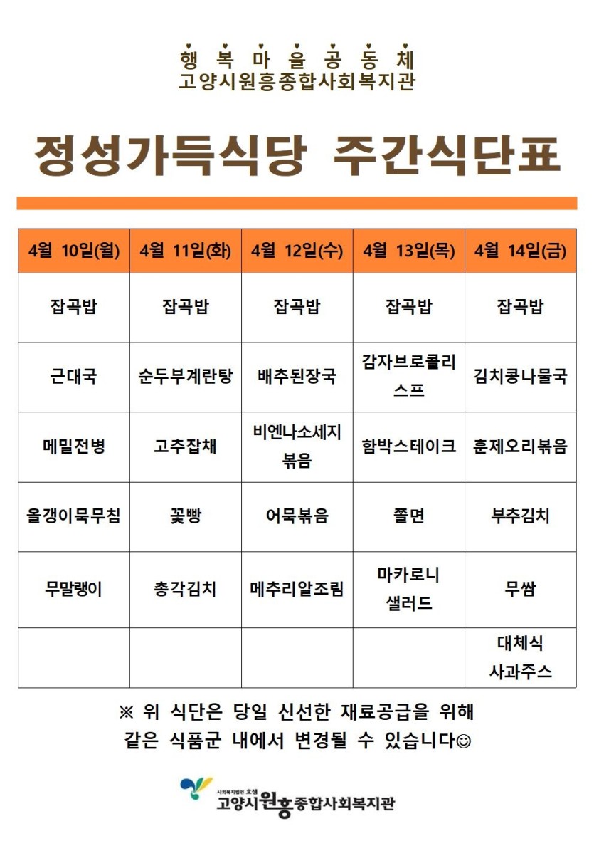 일반 4월 2째주 정성가득식당 식단 안내 페이지 정보 작성자 관리자 댓글 0건 조회1,712회 작성일 23-04-11 10:37 목록 본문 이전글2023년 어버이날 기념행사 도래울愛함께해孝 '무료 진료 안내' 23.04.14 다음글과장채용 서류전형 합격자 공지 23.04.03 댓글 0개 댓글목록 등록된 댓글이 없습니다.