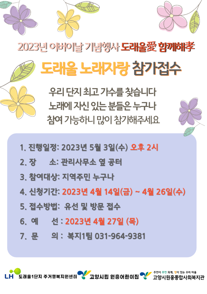 일반 2023년 어버이날 기념행사 도래울愛함께해孝 '도래울노래자랑 참가접수' 페이지 정보 작성자 관리자 댓글 0건 조회1,769회 작성일 23-04-14 18:10 목록 본문 이전글2023년 가정의 달 행사 '도래울 흥난DAY'안내 23.04.14 다음글2023년 어버이날 기념행사 도래울愛함께해孝 '무료 진료 안내' 23.04.14 댓글 0개 댓글목록 등록된 댓글이 없습니다.