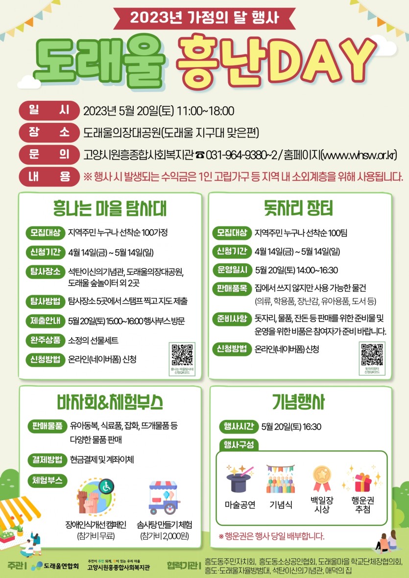 고양시원흥종합사회복지관에서는 2023년 가정의 달을 맞이하여 지역주민과 함께하는 '도래울 흥난DAY'행사를 진행합니다! 2023년 5월 20일(토) 오전 11시에 본 행사가 진행될 예정입니다. 흥나는 마을탐사대, 돗자리 장터의 경우 주민 참여형 행사로 사전접수가 진행됩니다.