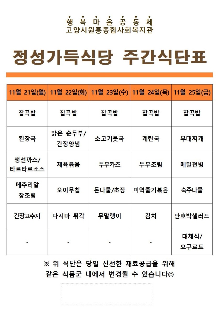 일반 11월 4째주 정성가득식당 식단 안내 페이지 정보 작성자 관리자 댓글 0건 조회1,501회 작성일 22-11-28 13:25 목록 본문 이전글11월 5째주 정성가득식당 식단 안내 22.11.28 다음글취사원 채용 최종합격자 공지 22.11.23 댓글 0개 댓글목록 등록된 댓글이 없습니다.
