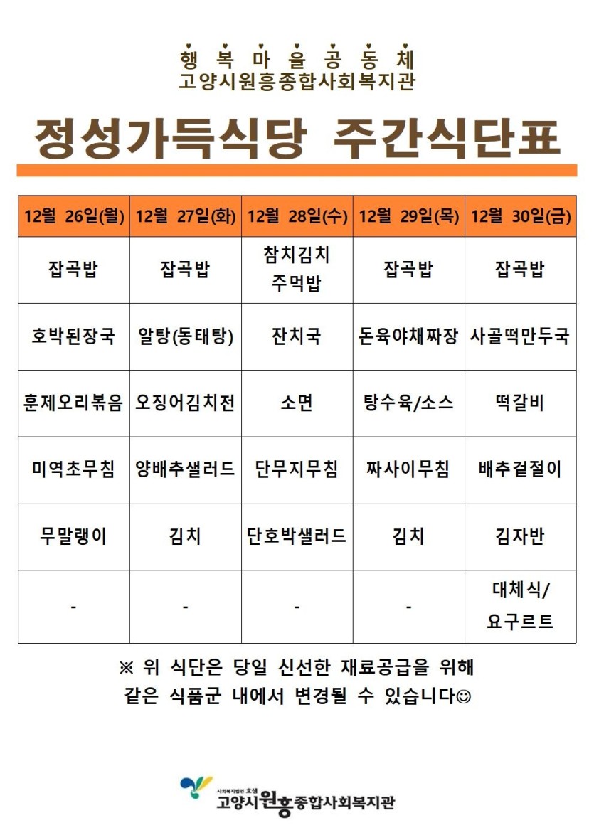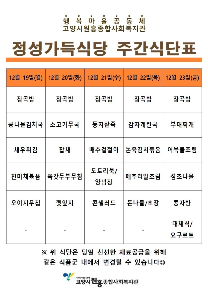 일반 12월 3,4째주 정성가득식당 식단 안내 페이지 정보 작성자 관리자 댓글 0건 조회1,581회 작성일 22-12-19 21:04 목록 본문 이전글2023년 평생교육프로그램 강사 긴급 채용 공고 22.12.20 다음글2023년 동계 사회복지 현장실습생 모집 공고 22.12.19 댓글 0개 댓글목록 등록된 댓글이 없습니다.