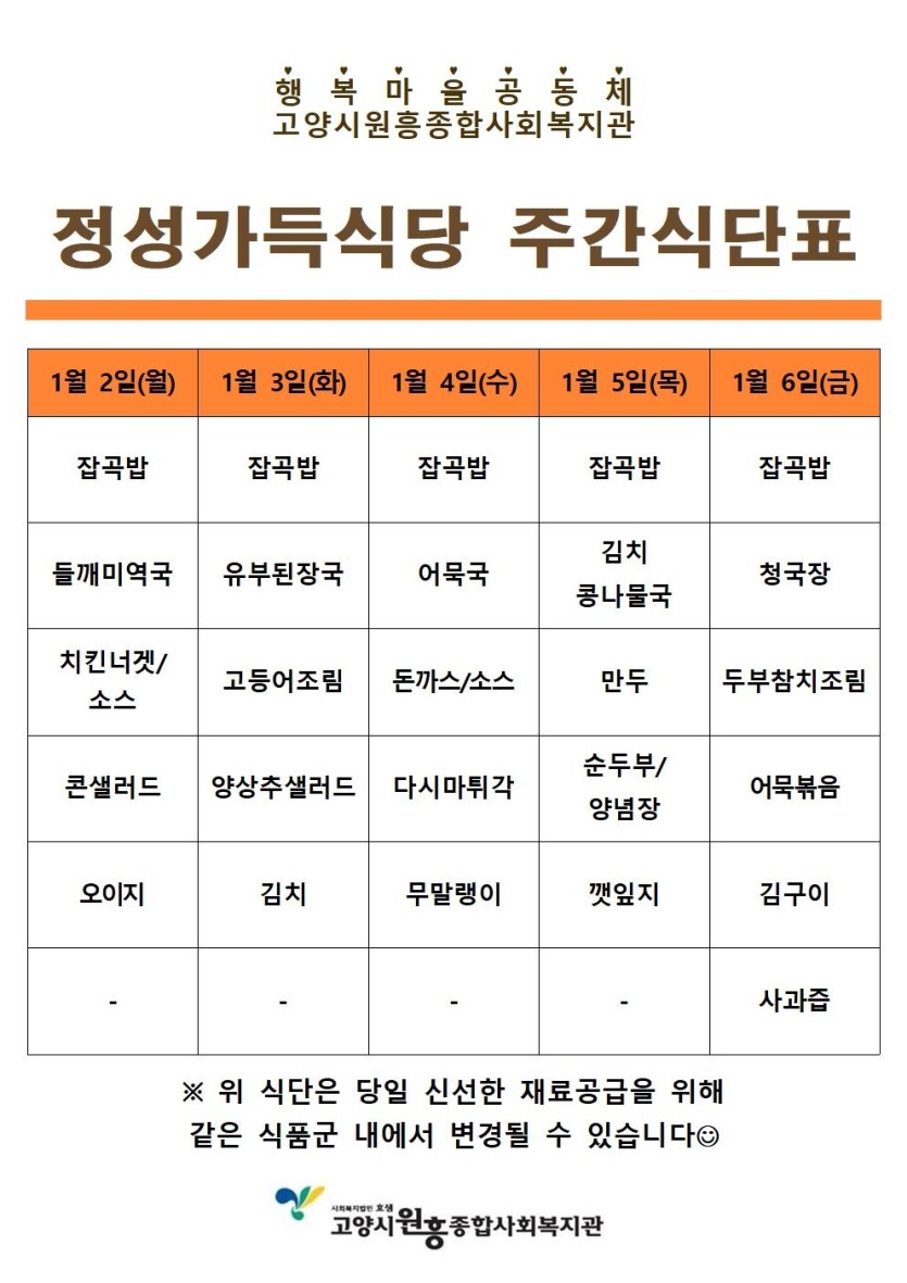 일반 1월 첫째주 정성가득식당 식단 안내 페이지 정보 작성자 관리자 댓글 0건 조회1,610회 작성일 23-01-02 18:53 목록 본문 이전글1월 둘째주 정성가득식당 식단 안내 23.01.10 다음글2023년 원흥종합사회복지관 식자재 납품업체 선정 결과 22.12.27 댓글 0개 댓글목록 등록된 댓글이 없습니다.