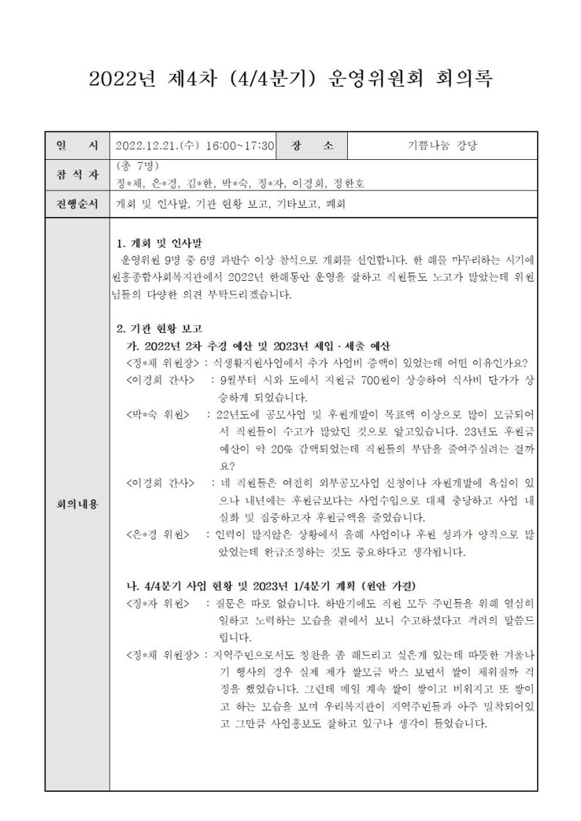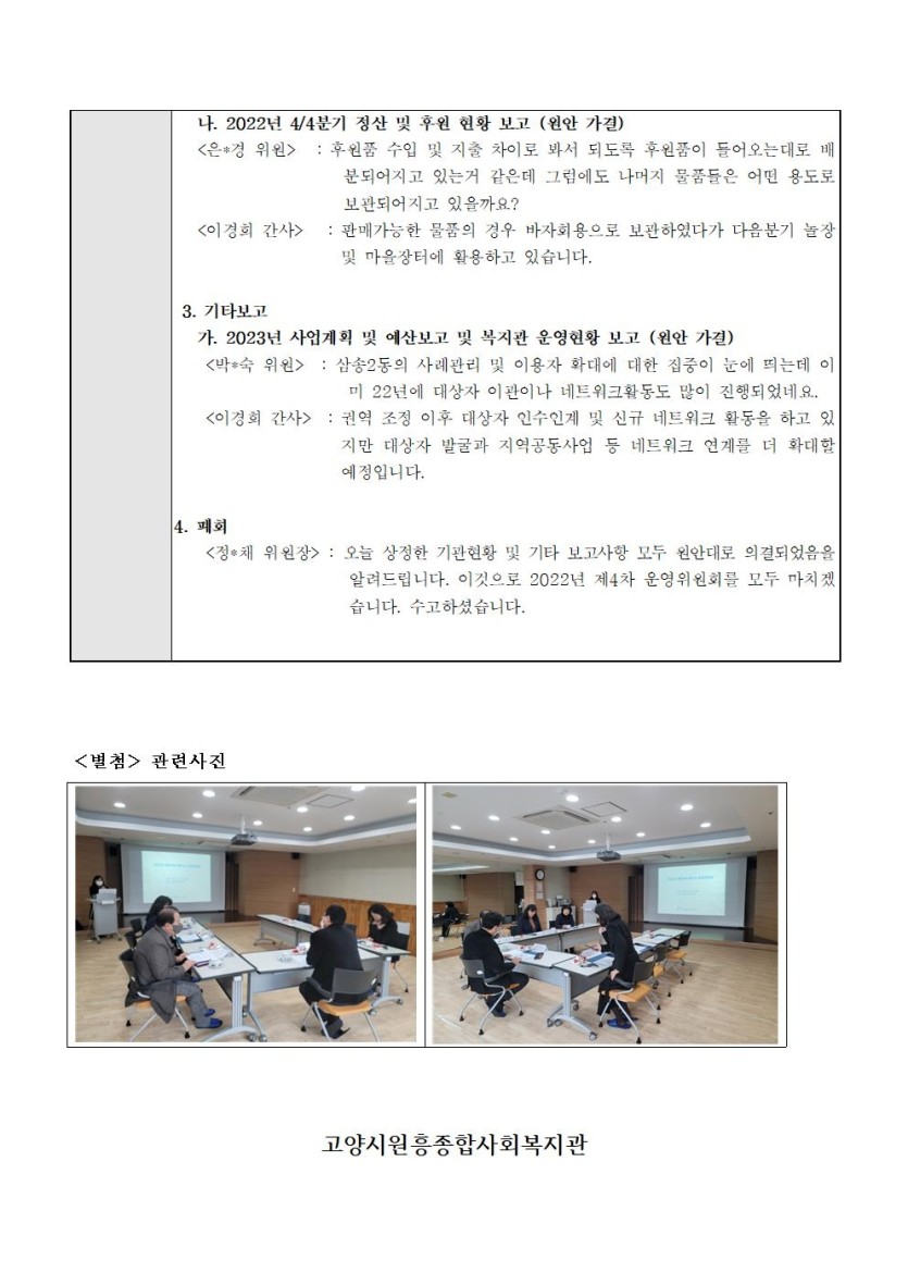 고양시원흥종합사회복지관 2022년 제1차 운영위원회 회의록을 붙임과 같이 공고합니다.