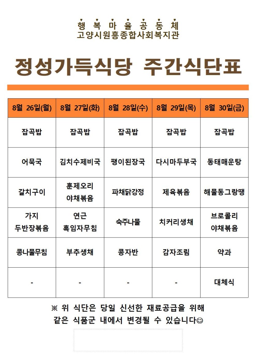 일반 8월 4째주 정성가득식당 식단 안내 페이지 정보 작성자 원흥종합사회복지관 댓글 0건 조회1,908회 작성일 24-08-23 16:01 목록 게시판 리스트 옵션 검색 본문 8월 4째주 정성가득식당 식단 안내 이전글9월 1째주 정성가득식당 식단 안내 24.09.02 다음글8월 3째주 정성가득식당 식단 안내 24.08.19 댓글 0개 댓글목록 등록된 댓글이 없습니다.