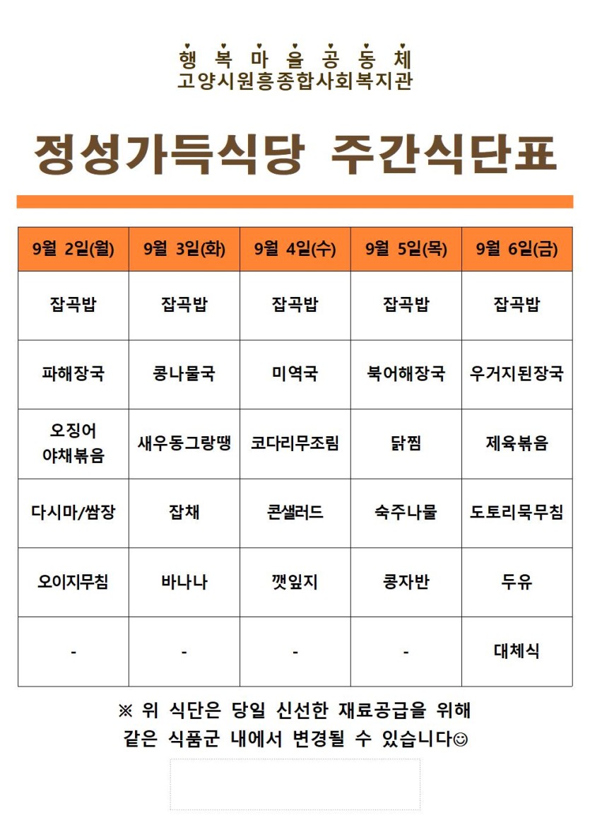 일반 9월 1째주 정성가득식당 식단 안내 페이지 정보 작성자 원흥종합사회복지관 댓글 0건 조회1,834회 작성일 24-09-02 13:11 목록 게시판 리스트 옵션 검색 본문 9월 1째주 정성가득식당 식단 안내 이전글9월 2째주 정성가득식당 식단 안내 24.09.06 다음글8월 4째주 정성가득식당 식단 안내 24.08.23 댓글 0개 댓글목록 등록된 댓글이 없습니다.