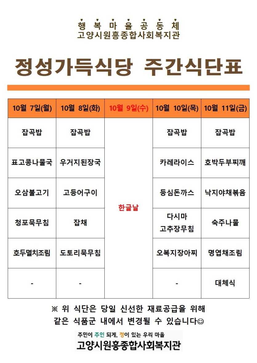 일반 10월 2째주 정성가득식당 식단 안내 페이지 정보 작성자 원흥종합사회복지관 댓글 0건 조회1,566회 작성일 24-10-02 13:24 목록 게시판 리스트 옵션 검색 본문 10월 2째주 정성가득식당 식단 안내 이전글2025년 식자재 납품업체 선정계획 공고 24.10.31 다음글10월 1째주 정성가득식당 식단 안내 24.09.27 댓글 0개 댓글목록 등록된 댓글이 없습니다.