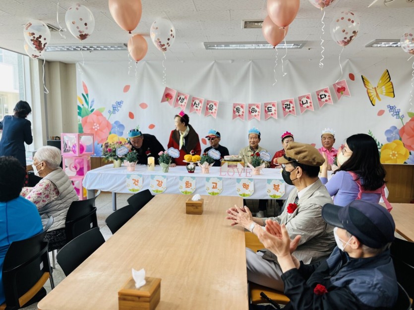 3일 오전에 진행한 어르신 생신잔치는 고양시 국공립어린이집 덕양1지부주관으로 소속 10개 어린이집 원장들이 정성껏 준비한 카네이션과 선물, 그리고 맛있는 생일상 등 풍성한 축하 자리를 마련하였습니다. 또한 주거행복지원센터에서도 단지 내 어르신들께 감사의 마음을 담아 카네이션과 떡을 선사하였습니다.