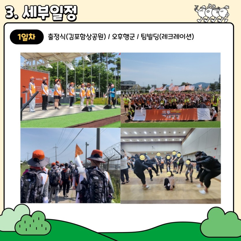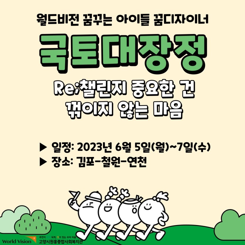 2023년 월드비전에서는 꿈디자이너 참여 아동 중 희망아동을 대상으로 6.5.(월)~6.7.(수) 2박3일간 강화-철원-연천을 걷는 「HO!국토대장정-Re;챌린지 중요한 건 꺾이지 않는 마음」을 진행했습니다.