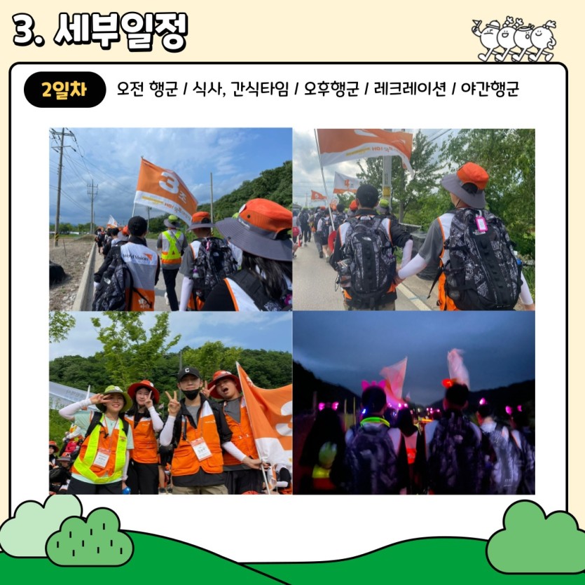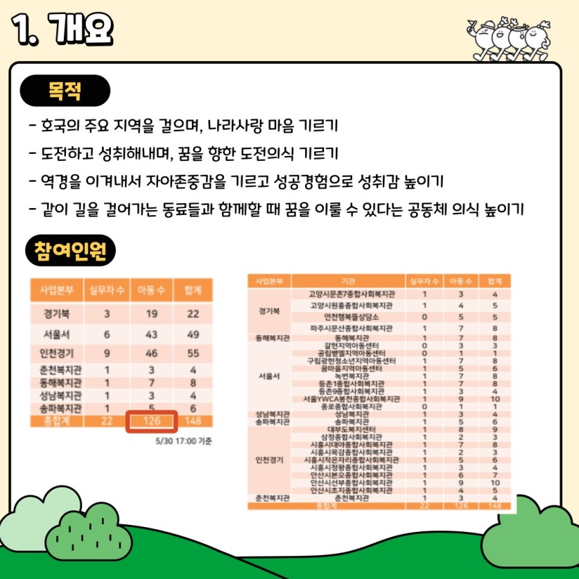 총 126명의 아동이 22명의 스태프와 함께 하루에 20km씩 걸으며 총 60km의 여정을 다녀왔습니다.