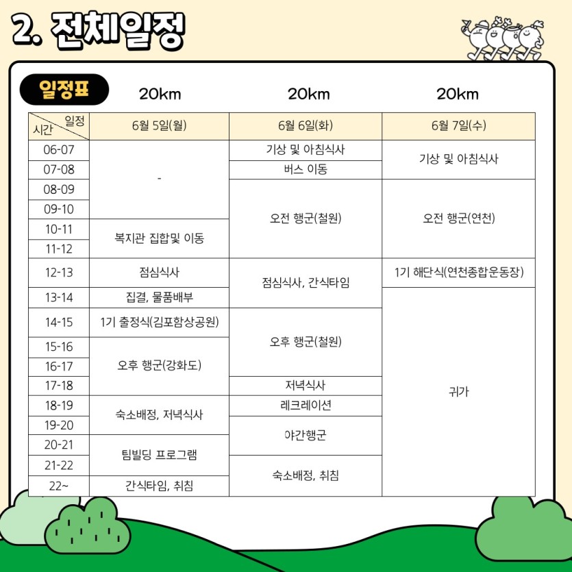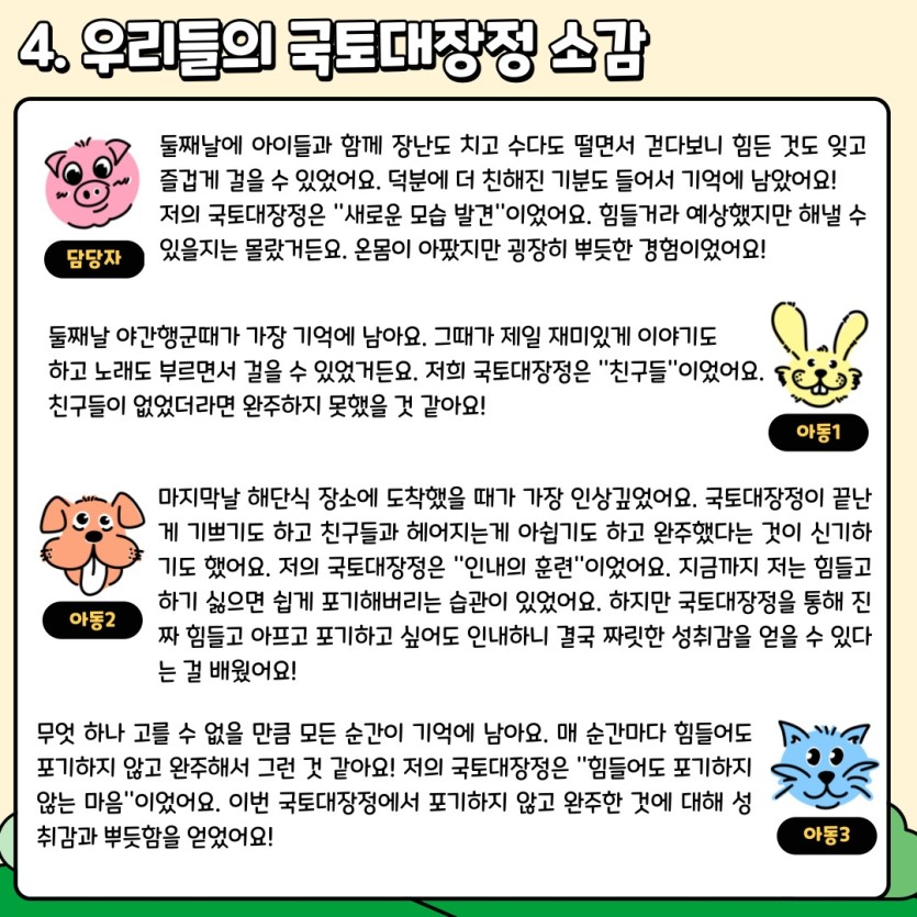 오전 행군은 물론이고 야간 행군까지 진행되다보니 아이들 모두 체력의 한계에 부딪히기도 했습니다. 온 몸이 아파 매 순간 포기하고 싶은 마음도 들었지만 서로가 서로의 힘이 되어 끝까지 해냈습니다.
