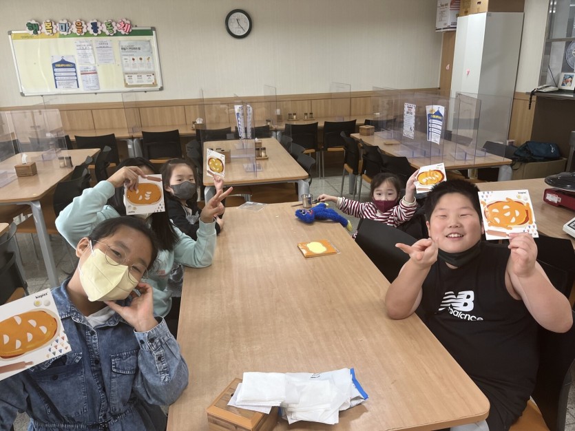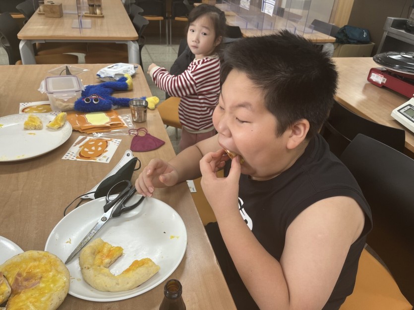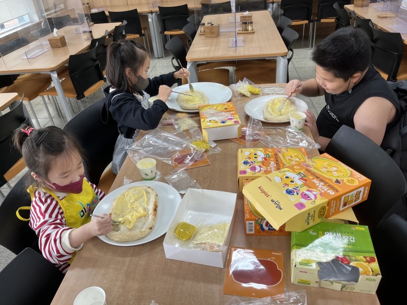 아이들과는 피자키트를 활용하여 베이컨 고구마 피자를 만들었는데요, 아이들이 직접 피자를 만들어 보며 자신감을 향상시킬 수 있었습니다. 더불어 친구들과 자신이 만든 피자를 나눠 먹는 시간을 가지며 시식 평가회를 가짐으로써 다양한 맛 표현과 감정표현을 나타내보는 시간을 가졌습니다.