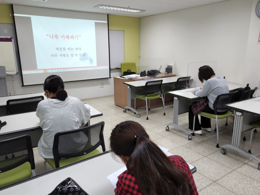 부모교육에서는 현재의 심정을 나누고, 의사소통과 관련된 간단한 검사를 시작해보며 프로그램을 열었습니다. 또한 자녀존중 체크리스트, 분노체크리스트 검사를 하며 '자기이해'를 촉진해보는 시간이였으며, 참여자 어머님들도 진지한 모습으로 집중하며 진행하였습니다.