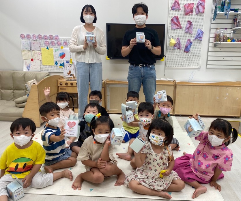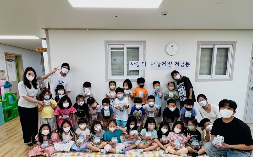나눌거양은 지역주민들을 위한 기금을 아이들이 직접 동전을 모음으로써 나눔문화를 아이들에게 알려주고자 합니다. 나눌거양 모금함은 재활용이 가능한 종이재질로 제작이 되었고 지구를 위한 친환경 생활수칙을 저금통 한 면에 기입함으로써 아이들 친환경 교육에도 도움이 되도록 하였습니다.