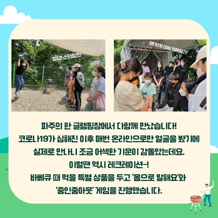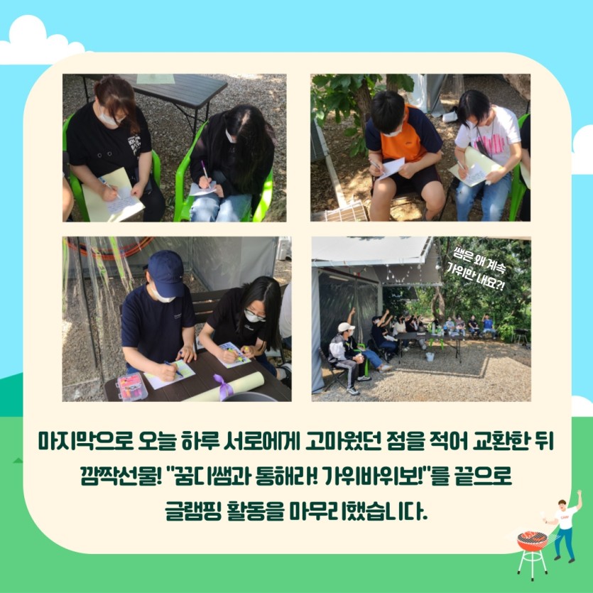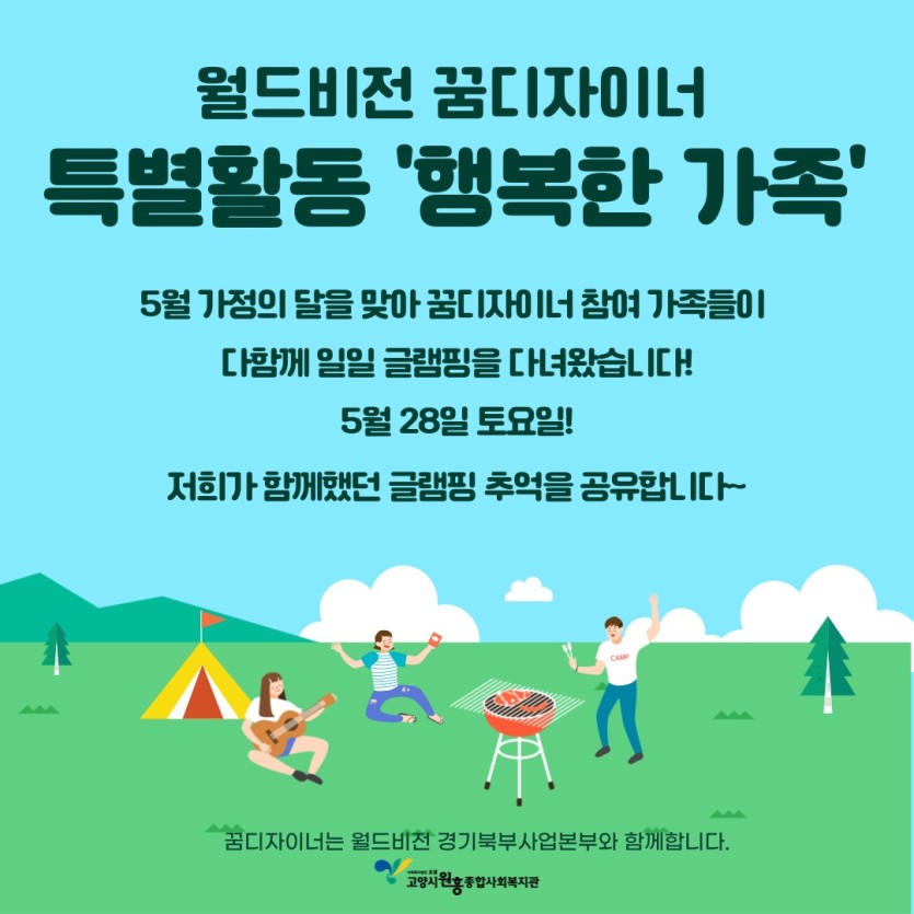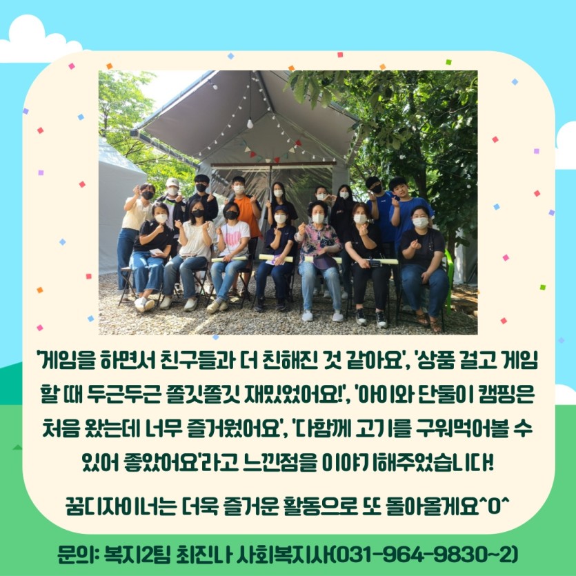 2022년 꿈디자이너 특별활동 프로그램 '행복한 가족' 글램핑 페이지 정보 작성자 관리자 댓글 0건 조회559회 작성일 22-05-30 18:58 목록 본문 이전글이음사진관 서삼릉 야외출사 진행 22.05.30 다음글<5월 과일봉사단과 함께하는 "과일꾸러미 배달"> 22.05.27 댓글 0 댓글목록 등록된 댓글이 없습니다.