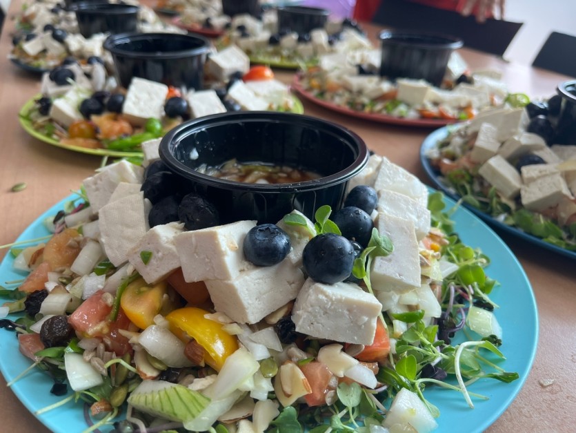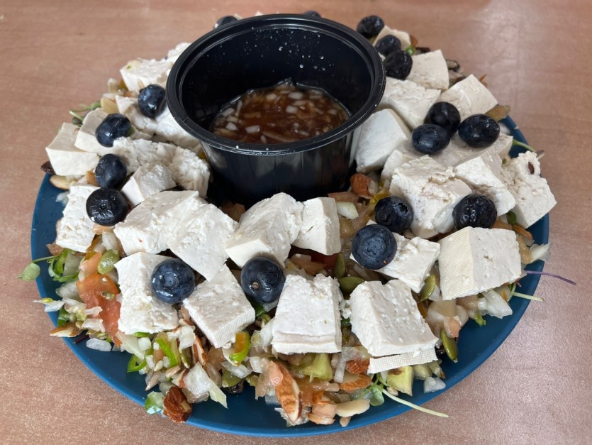다양한 야채들과 견과류, 두부를 섞어 맛있는 두부샐러드를 완성했습니다.