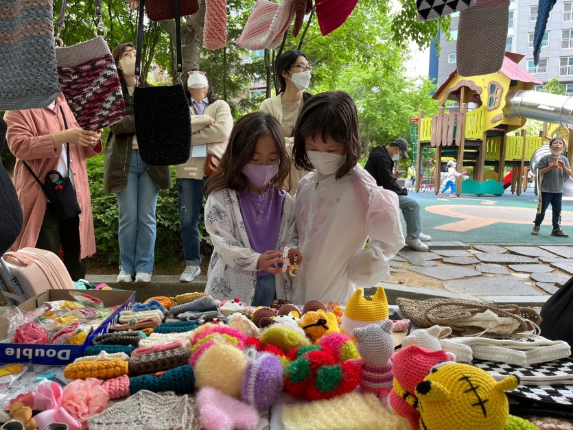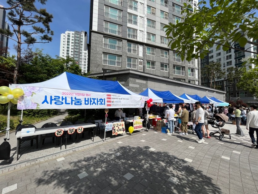 14일 토요일에는 도래울마을 2, 6단지 내에서 사랑나눔바자회를 개최하였으며 다양한 생필품, 생활용품, 의류 등을 판매하였습니다. 또한 어린이를 위한 이벤트부스에서는 달고나뽑기를 진행하여 뽑기에 성공한 참여자들에게는 선물도 제공하였습니다.