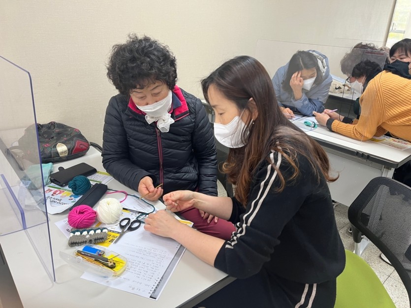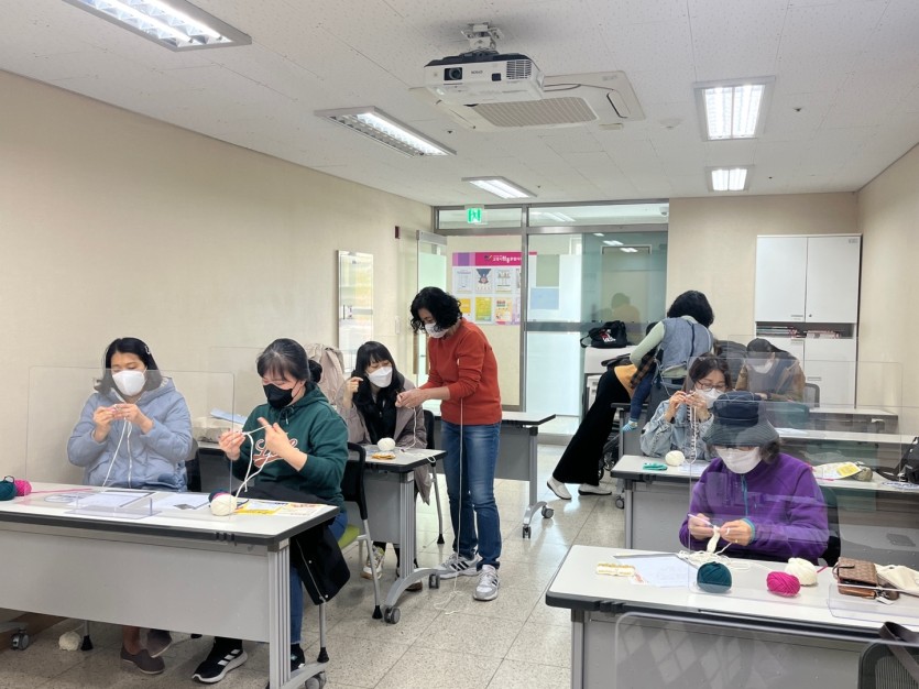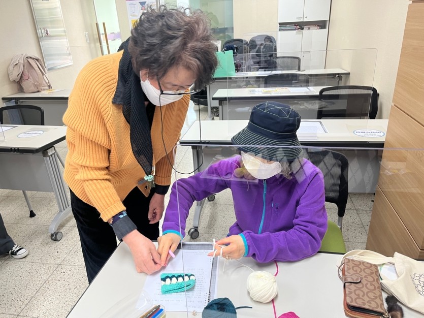 이번 수업은 특별히 복지관 주민모임 <쪼물딱살롱> 회원분들이 선생님이 되어 지역주민 8명을 대상으로 뜨개수업을 진행하였습니다.