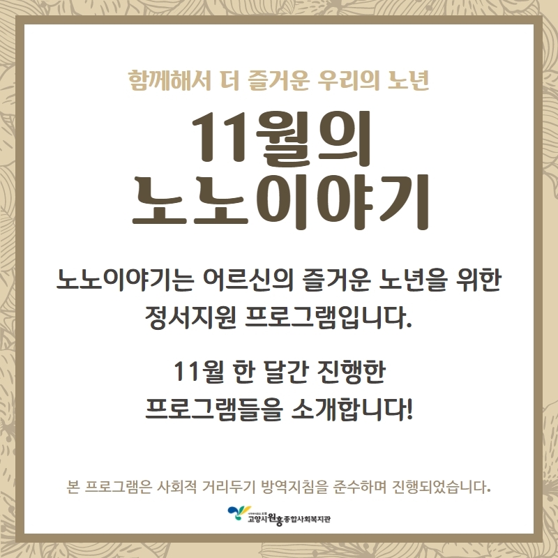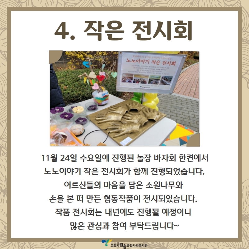 11월 노노이야기 활동 페이지 정보 작성자 관리자 댓글 0건 조회524회 작성일 21-12-09 16:03 목록 본문 이전글국민건강보험공단 고양덕양지사 후원금 전달식 21.12.09 다음글따뜻한 겨울나기 지역노점상인 털모자 나눔 행사 진행 21.12.07 댓글 0 댓글목록 등록된 댓글이 없습니다.