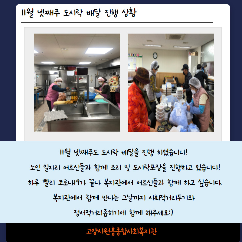 11월 넷째주 경로식당 이야기 페이지 정보 작성자 관리자 댓글 0건 조회504회 작성일 20-11-27 13:53 목록 본문 이전글11월 과일봉사단 진행 20.11.27 다음글2020년 외부슈퍼비전 회의 20.11.23 댓글 0 댓글목록 등록된 댓글이 없습니다.