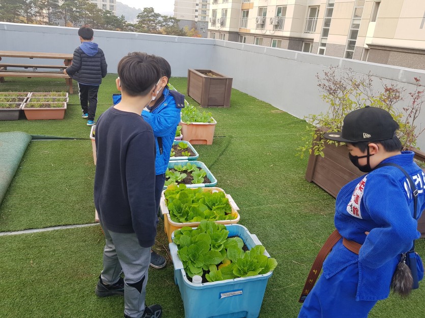 이날 참여한 아동 4명과 함께 지난 9월부터 참여아동들과 길러온 작물들을 수확하고
