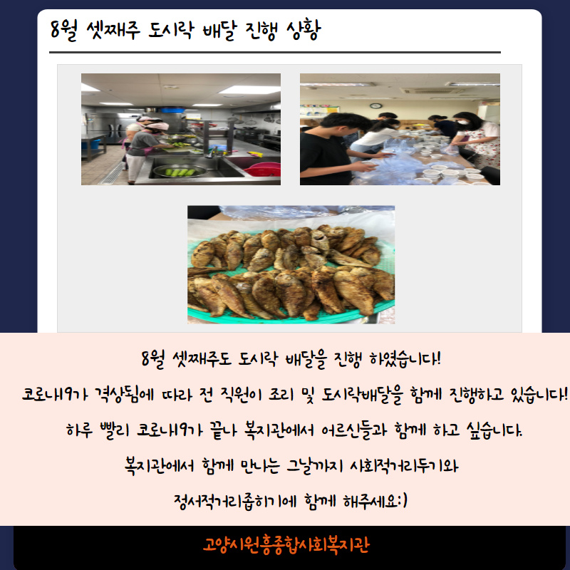 8월 셋째주 경로식당 이야기 페이지 정보 작성자 관리자 댓글 0건 조회504회 작성일 20-08-24 13:19 목록 본문 이전글8월 넷째주 경로식당 이야기 20.08.31 다음글제 75주년 광복절 특별기획프로그램 "광복이와 함께하는 역사 이야기" 진행 20.08.21 댓글 0 댓글목록 등록된 댓글이 없습니다.