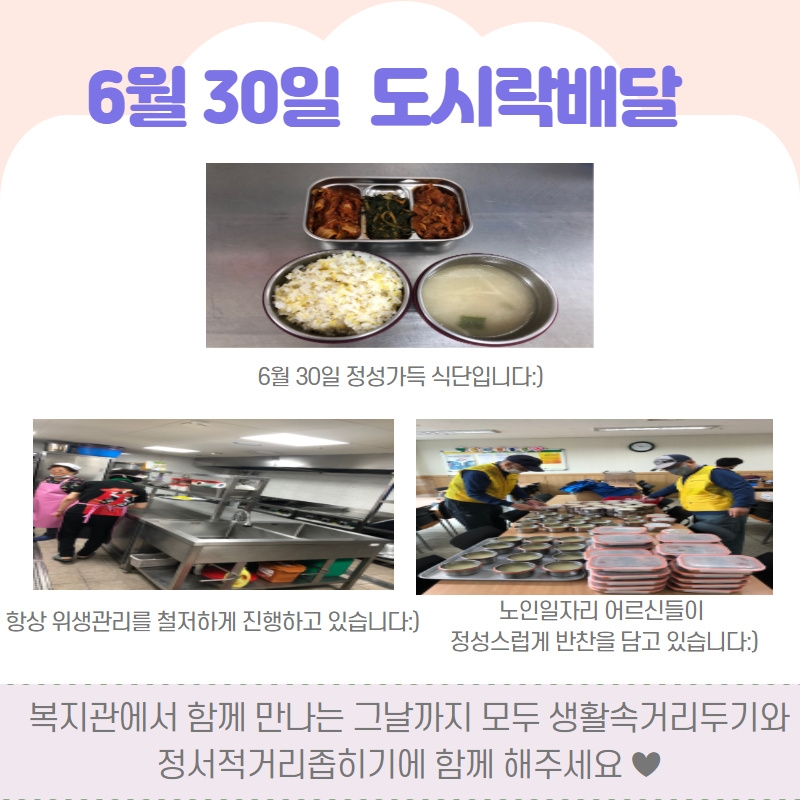 6월 30일 코로나19 확산방지를 위한 경로식당 이용자 분들 대상 도시락 배달 진행 페이지 정보 작성자 관리자 댓글 0건 조회500회 작성일 20-07-01 09:01 목록 본문 이전글일상생활지원사업 - 나누고, 들르고, 이해하고! '나들이' 6월 이야기 20.07.01 다음글6월 29일 코로나19 확산방지를 위한 경로식당 이용자 분들 대상 도시락 배달 진행 20.06.30 댓글 0 댓글목록 등록된 댓글이 없습니다.
