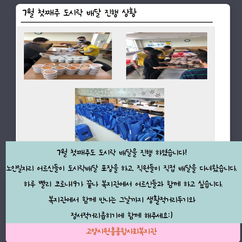 7월 첫째주 경로식당 이야기 페이지 정보 작성자 관리자 댓글 0건 조회511회 작성일 20-07-17 09:48 목록 본문 이전글7월 둘째주경로식당 이야기 20.07.17 다음글[고양시원흥종합사회복지관] 임대단지 아파트 복지 네트워크 구축을 위한 업무협약식 진행 20.07.10 댓글 0 댓글목록 등록된 댓글이 없습니다.