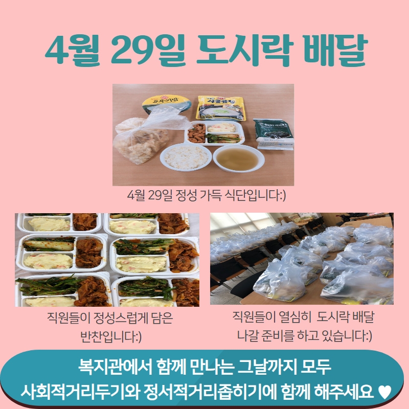 4월 29일 코로나19 확산방지를 위한 경로식당 이용자 분들 대상 도시락 배달 진행 페이지 정보 작성자 관리자 댓글 0건 조회494회 작성일 20-05-04 13:04 목록 본문 이전글5월 4일 코로나19 확산방지를 위한 경로식당 이용자 분들 대상 도시락 배달 진행 20.05.06 다음글4월 28일 코로나19 확산방지를 위한 경로식당 이용자 분들 대상 도시락 배달 진행 20.05.04 댓글 0 댓글목록 등록된 댓글이 없습니다.