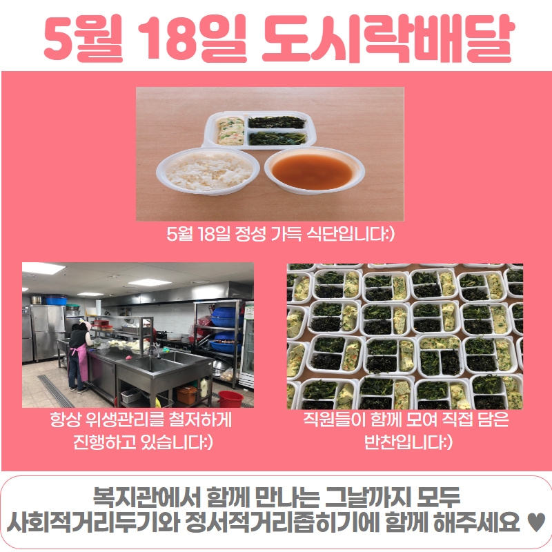 5월 18일 코로나19 확산방지를 위한 경로식당 이용자 분들 대상 도시락 배달 진행 페이지 정보 작성자 관리자 댓글 0건 조회483회 작성일 20-05-19 10:49 목록 본문 이전글마음방역캠페인을 참여해주셔서 감사합니다. 20.05.19 다음글5월 14,15일 코로나19 확산방지를 위한 경로식당 이용자 분들 대상 도시락 배달 진행 20.05.18 댓글 0 댓글목록 등록된 댓글이 없습니다.