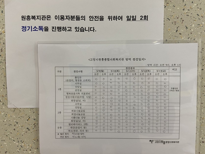 휴관기간에도 원흥복지관은 코로나19 예방을 위해 철저한 방역을 실시하겠습니다.