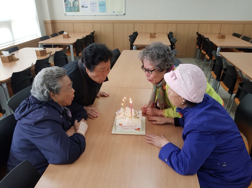 어르신들과 모임 첫 회기를 기념하기 위하여 케이크에 촛불을 붙였습니다.