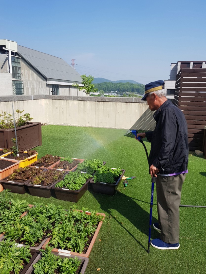 어르신들은 옥상 텃밭에 물을 뿌리자 생기는 무지개를 보며