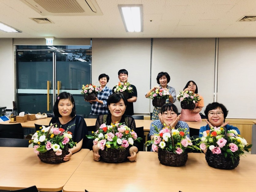 같은 재료지만 각 자 다른 모양의 개성이 담긴 꽃바구니가 완성되었습니다.