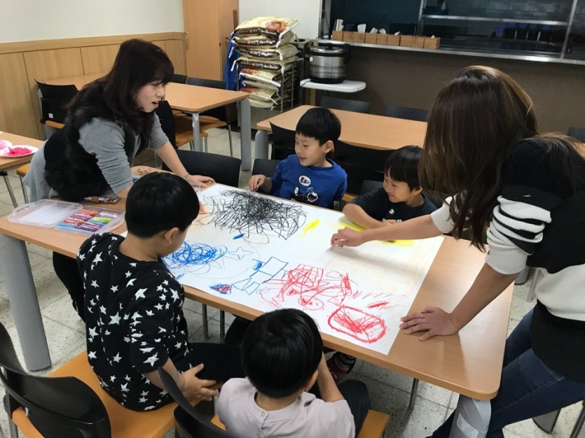 오늘은 유아반 친구들이 모여 집단미술프로그램을 하였습니다.