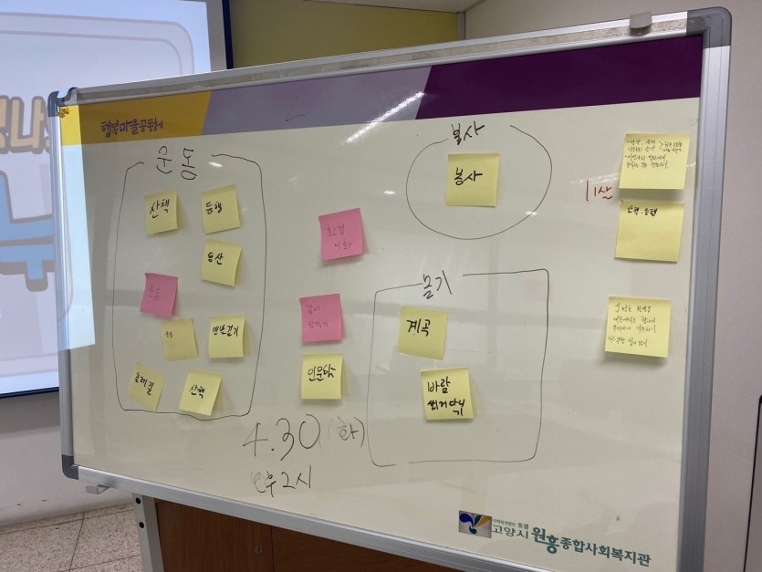 자기소개 후에는 서로가 어떤 관심사를 갖고 있는지, 어떤 활동을 1년동안 하고 싶은지 이야기를 나눴습니다. 오늘 활동에 참여할지 말지 고민이 되었다고 이야기 해주신 참여자분은 '다른 사람들의 아이디어에도 내가 하고 싶던 것들이 있고, 여러 사람의 이야기를 듣다 보니까 오길 잘했다는 생각이 듭니다. 남자들이 복지관을 이용하거나 모임이 꾸려지는 게 별로 없는데 이런 모임이 꼭 필요했습니다.' 라고 소감을 남겨주셨습니다.