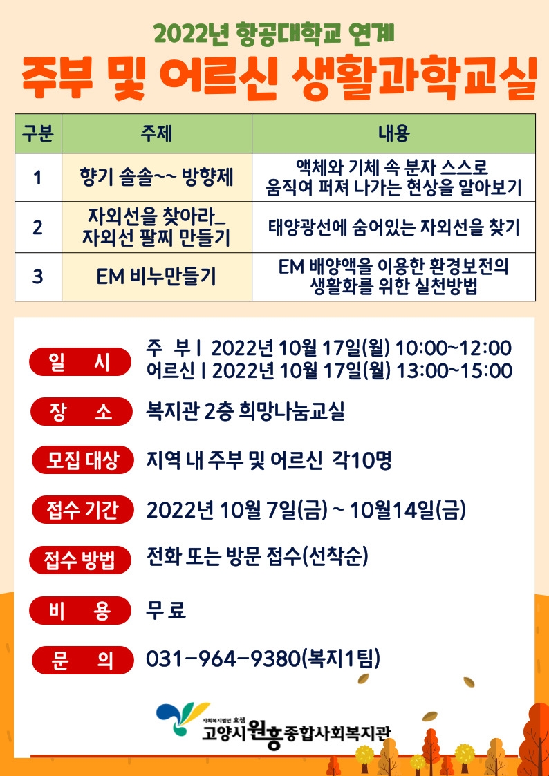 2022년 주부&실버 생활과학교실 수강생 모집 페이지 정보 작성자 관리자 댓글 0건 조회312회 작성일 22-10-07 17:22 목록 본문 이전글2023년 장애인일자리사업(일반형,복지일자리) 참여자 모집 공고 22.11.04 다음글2023년 2분기(4~6월) 평생교육 프로그램 수강생 모집 안내 23.03.13 댓글 0 댓글목록 등록된 댓글이 없습니다.
