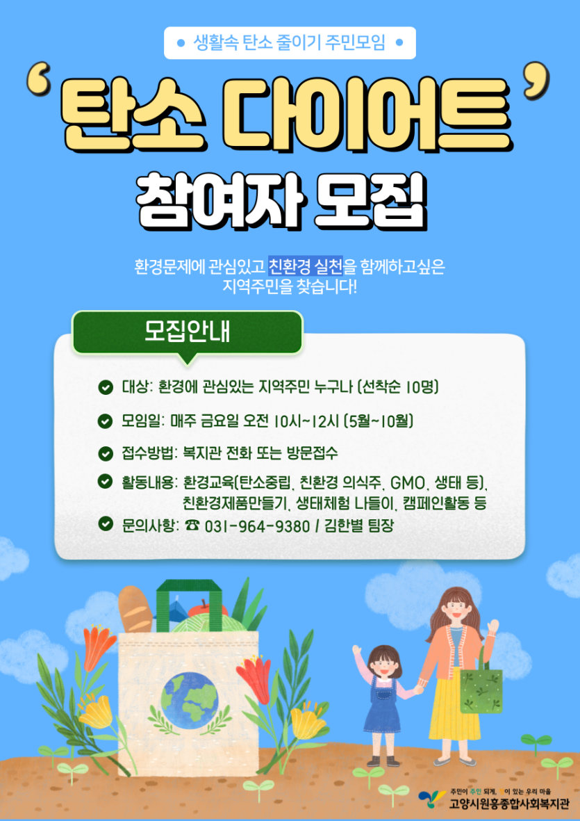 2022년 환경 주민모임 <탄소다이어트> 참여자 모집홍보 페이지 정보 작성자 관리자 댓글 0건 조회378회 작성일 22-04-15 10:27 목록 본문 이전글2022년 생활과학교실 참여자 모집 22.04.25 다음글[오픈클래스] 도구필라테스 원데이 클래스 수강생 모집 22.06.09 댓글 0 댓글목록 등록된 댓글이 없습니다.