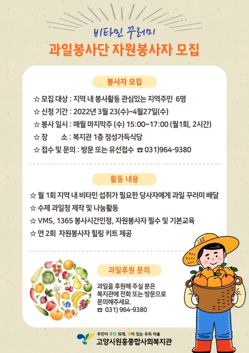 영양 불균형 문제를 겪는 주민들의 영양소 섭취를 돕고 지역사회에 대한 관심을 향상시키고자 과일 봉사단을 양성하고자 합니다. 많은 참여 부탁드립니다.