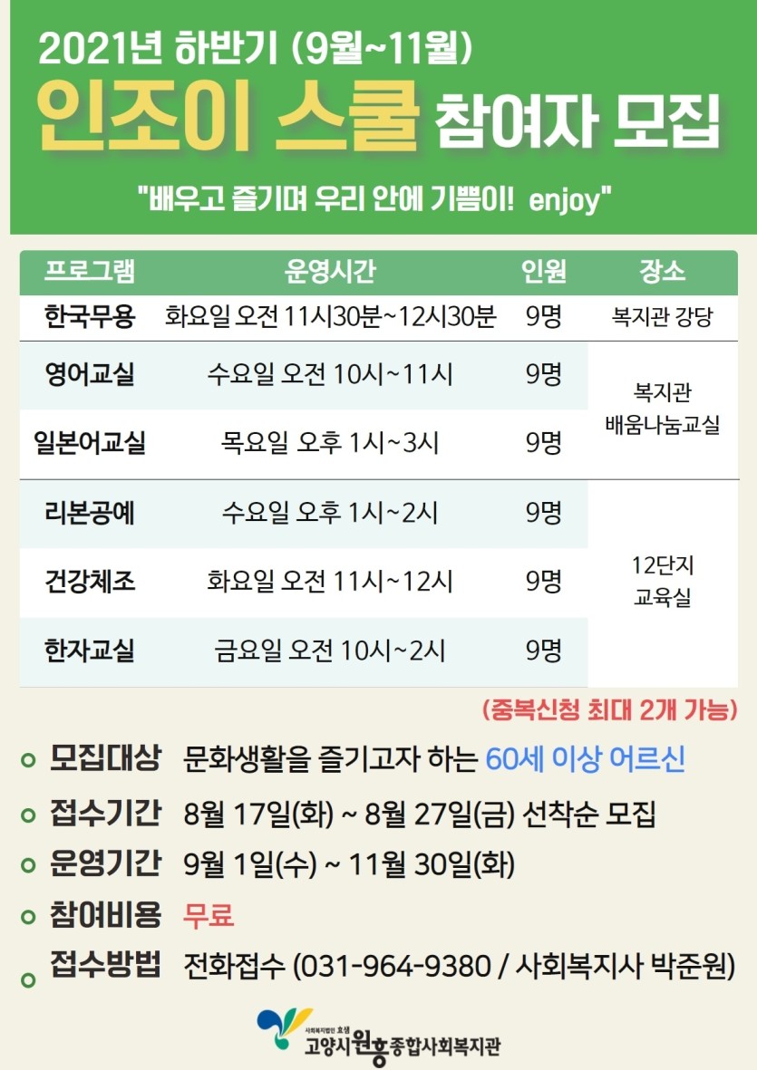 2021년 하반기 인조이 스쿨 참여자 모집 (9월~11월) 페이지 정보 작성자 관리자 댓글 0건 조회405회 작성일 21-08-13 16:11 목록 본문 이전글2021년 성인장애인 평생교육프로그램 <리본공예> 하반기 참여자 추가모집 21.08.23 다음글2021 평생교육 4분기 프로그램 모집 21.09.23 댓글 0 댓글목록 등록된 댓글이 없습니다.