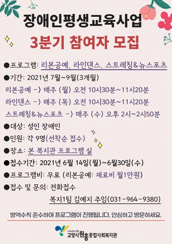 3분기 장애인평생교육프로그램 참여자 모집 안내 페이지 정보 작성자 관리자 댓글 0건 조회370회 작성일 21-06-11 13:30 목록 본문 이전글꿈자람 방과후돌봄프로그램 참여자 모집 21.06.14 다음글장애인평생교육프로그램 컴퓨터자격증취득반(ITQ한글) 참여자 모집 21.06.22 댓글 0 댓글목록 등록된 댓글이 없습니다.