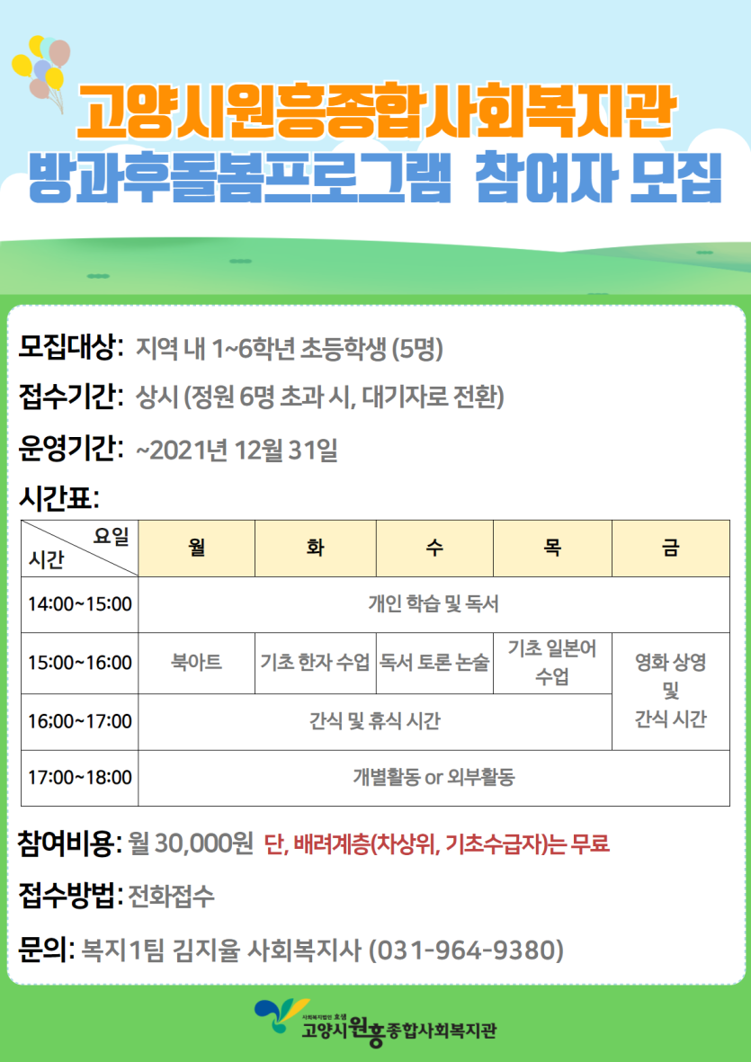 꿈자람 방과후돌봄프로그램 참여자 모집 페이지 정보 작성자 관리자 댓글 0건 조회378회 작성일 21-06-14 13:57 목록 본문 이전글3분기 평생교육프로그램 참여자 모집(성인, 아동) 21.06.14 다음글3분기 장애인평생교육프로그램 참여자 모집 안내 21.06.11 댓글 0 댓글목록 등록된 댓글이 없습니다.