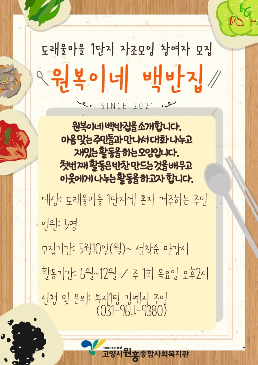 도래울마을 1단지 자조모임 "원복이네 백반집" 참여자 모집 페이지 정보 작성자 관리자 댓글 0건 조회366회 작성일 21-05-04 16:51 목록 본문 이전글가정의 달 기념 수미네 홈쿠킹 참여자 모집 (정정) 21.05.10 다음글마중물 원데이클래스 '힐링수채화' 참여자 모집 21.05.14 댓글 0 댓글목록 등록된 댓글이 없습니다.