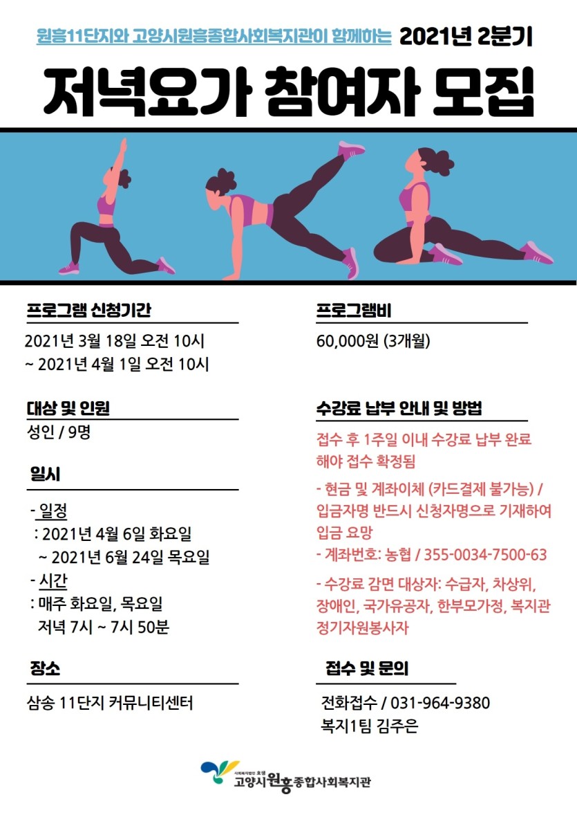 원흥11단지 저녁요가 참여자 모집 페이지 정보 작성자 관리자 댓글 0건 조회377회 작성일 21-03-17 17:17 목록 본문 이전글평생교육사업(어르신) - 인조이스쿨 참가자 모집 21.03.25 다음글어버이날 청소년 자원봉사 프로그램 - 카네이션 제작 참여자 모집 21.04.26 댓글 0 댓글목록 등록된 댓글이 없습니다.