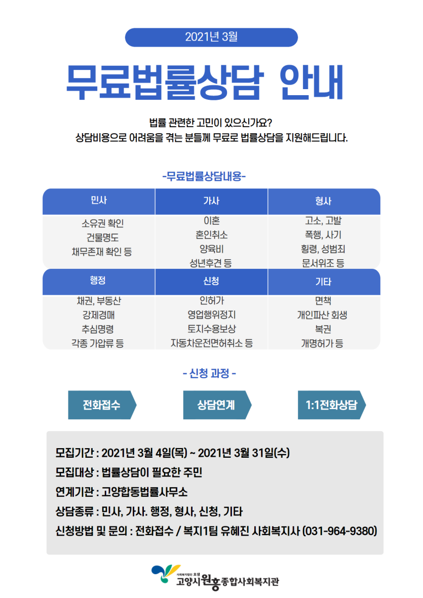 3월 무료법률상담 신청자 모집 페이지 정보 작성자 관리자 댓글 0건 조회326회 작성일 21-03-05 10:47 목록 본문 이전글"도래울마을연합회"와 함께하는 마을 청소 성인 자원봉사자 모집 21.03.05 다음글코로나블루 극복을 위한 우리동네 마음건강지킴이 '건강해 봄' 참여자 모집 21.03.05 댓글 0 댓글목록 등록된 댓글이 없습니다.