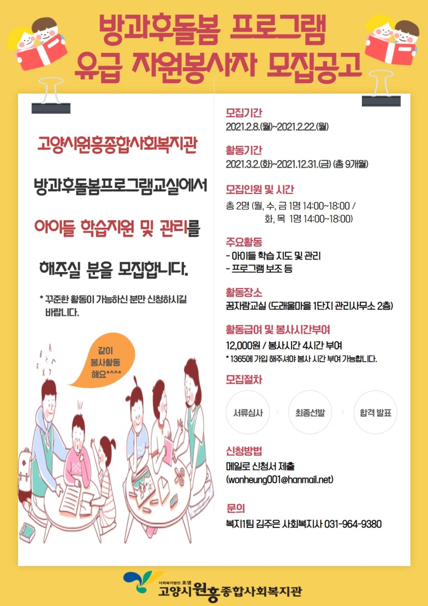 방과후돌봄프로그램 유급 자원봉사자 모집공고 페이지 정보 작성자 관리자 댓글 0건 조회463회 작성일 21-02-09 12:44 목록 본문 첨부파일 자원봉사 신청서.hwp (32.0K) 이전글2021년 1분기 생활과학교실 유아반 모집 20.12.23 다음글놀러와 우리동네 마을장터! '놀장' 바자회 참여자 모집 21.02.22 댓글 0 댓글목록 등록된 댓글이 없습니다.