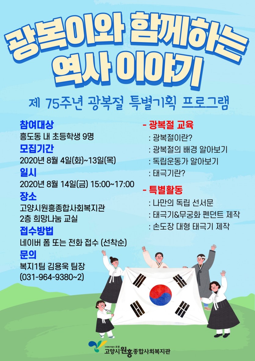 [고양시원흥종합사회복지관]제 75주년 광복절 특별기획프로그램 '광복이와 함께하는 역사이야기'[선착순 마감]